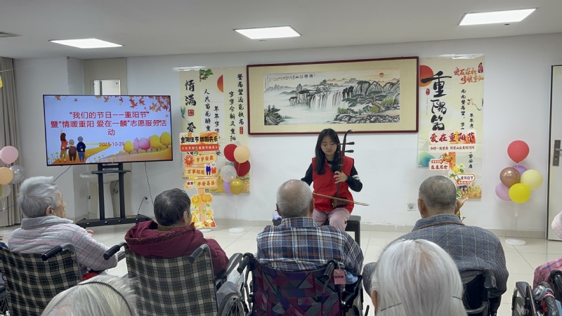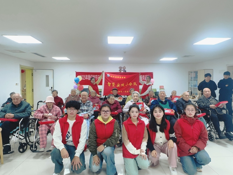 10月29日,重阳节当天,学院学生党支部组织智贤实践小分队前往连云港市第一人民医院一麟医养结合养老院,开展“情暖重阳,爱在一麟”主题慰问活动。志愿者带着精心准备的文艺节目和真挚祝福,为长者们送去秋日的温暖。活动现场,二胡独奏《查尔达什》旋律激昂柔美,展现了扎实的专业功底;经典老歌《我只在乎你》温婉深情,引发了老人们的共鸣;群舞《上春山》活泼灵动,传递着青春的朝气。最令人动容的是,在志愿者的热情感染下,多位老人主动加入,共同高歌《歌唱祖国》,老少两代人用饱含深情的歌声唱响了爱国情怀。表演结束后,志愿者贴心为老人奉上点心暖茶,围坐聆听岁月故事,并送上节日礼物。