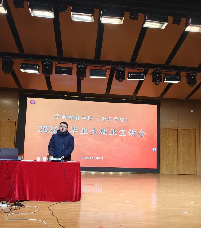 12月9日中午,学前教育学院(音乐学院)于绍曾楼音乐厅组织召开北京中兴幼教集团专场就业宣讲会。院长汪广华、院党总支副书记付艳出席活动,2026届全体毕业生及毕业班辅导员参加。本次宣讲会聚焦实习岗位对接,旨在帮助用人单位招聘优质实习生,同时为学生搭建实践就业的直通平台。