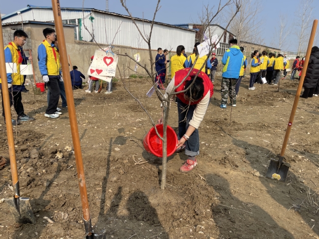 活动伊始,身着红马甲的志愿者迅速融入队伍。在小荒村党群服务中心工作人员的统一安排下,大家分工协作,有序完成树苗搬运、分发等准备工作。一株株茁壮的树苗从车上被接力传递至植树点位,现场井然有序,热火朝天的劳动氛围吸引了许多村民赞许的目光。正式植树环节中,志愿者挥锹铲土、扶苗填坑、踏土夯苗,每一个环节都一丝不苟。负责浇水的同学提着水桶往返于水源与植树区之间,细心为新栽树苗浇足“定根水”。铁锹破土的铿锵声与志愿者的欢笑声交织成一曲动人的春日协奏曲。经过几个小时的辛勤劳动,原本空旷的土地上一株株新苗迎风挺立,在和煦的春光中焕发出勃勃生机。