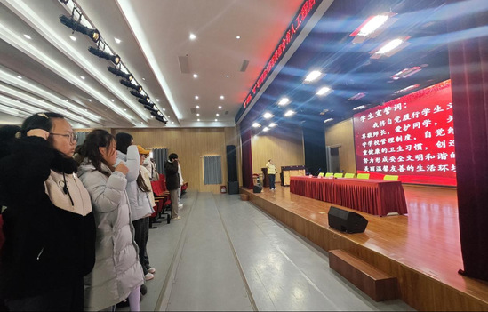 2025级生活委员代表在发言中,结合自身宿舍建设实际,分享了互帮互助、共同成长的体会,倡议全体同学以主人翁姿态参与宿舍建设。现场各班生活委员依次递交《宿舍文明承诺书》,以书面形式明确卫生、安全、纪律等责任,彰显共建共享的决心。全体学生代表庄严宣誓,将自觉履行学生义务,严格遵循宿舍管理制度,自觉维护宿舍安全,创造良好宿舍环境。