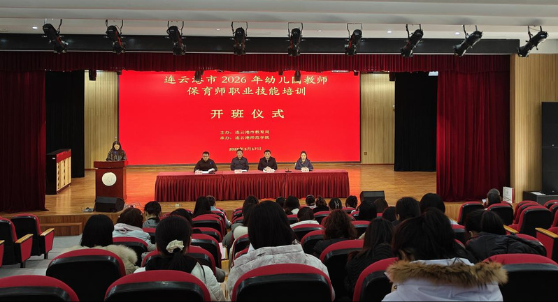 2026年3月17日上午8:30,连云港市2026年幼儿园教师保育师职业技能培训开班式,在连云港师范学院智贤剧场隆重举行。连云港市教育局副局长蒋猛、基础教育处副处长吉海霞,连云港师范学院副校长李传江,学前教育学院(音乐学院)院长汪广华、副院长李享,培训教师代表及第一期全体参训学员出席,开班式由汪广华主持。