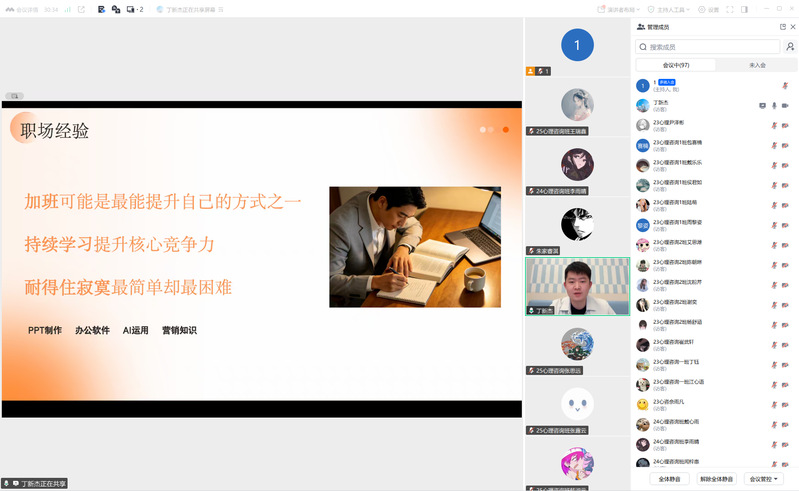 4月20日晚,学前教育学院(音乐学院)成功举办心理咨询专业优秀校友经验分享会,分享会邀请2020届优秀毕业生丁新杰担任主讲,他以“忠于内心,勇敢选择”为主题,为同学们带来了精彩的线上分享。23、24、25级心理咨询专业全体学生在线聆听。